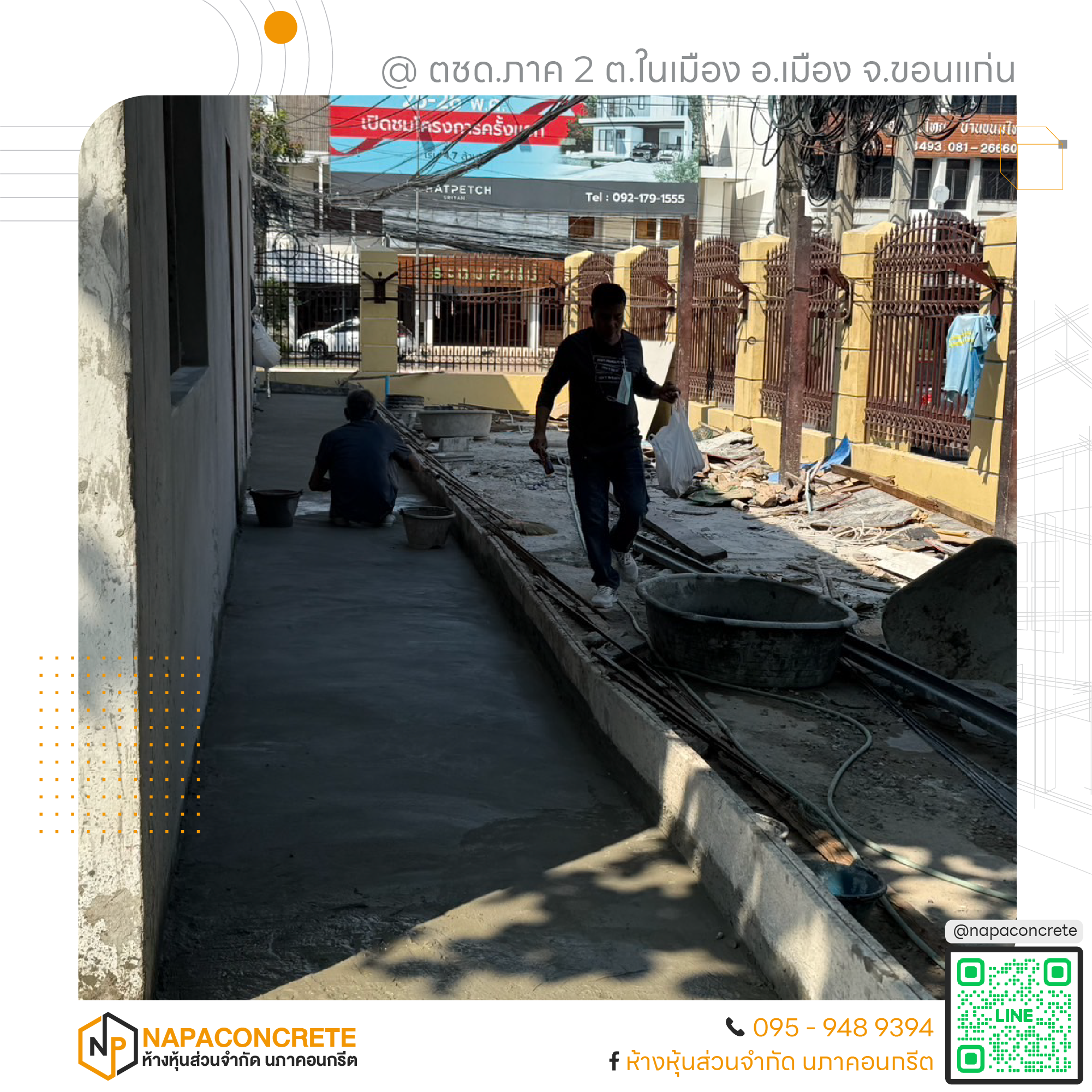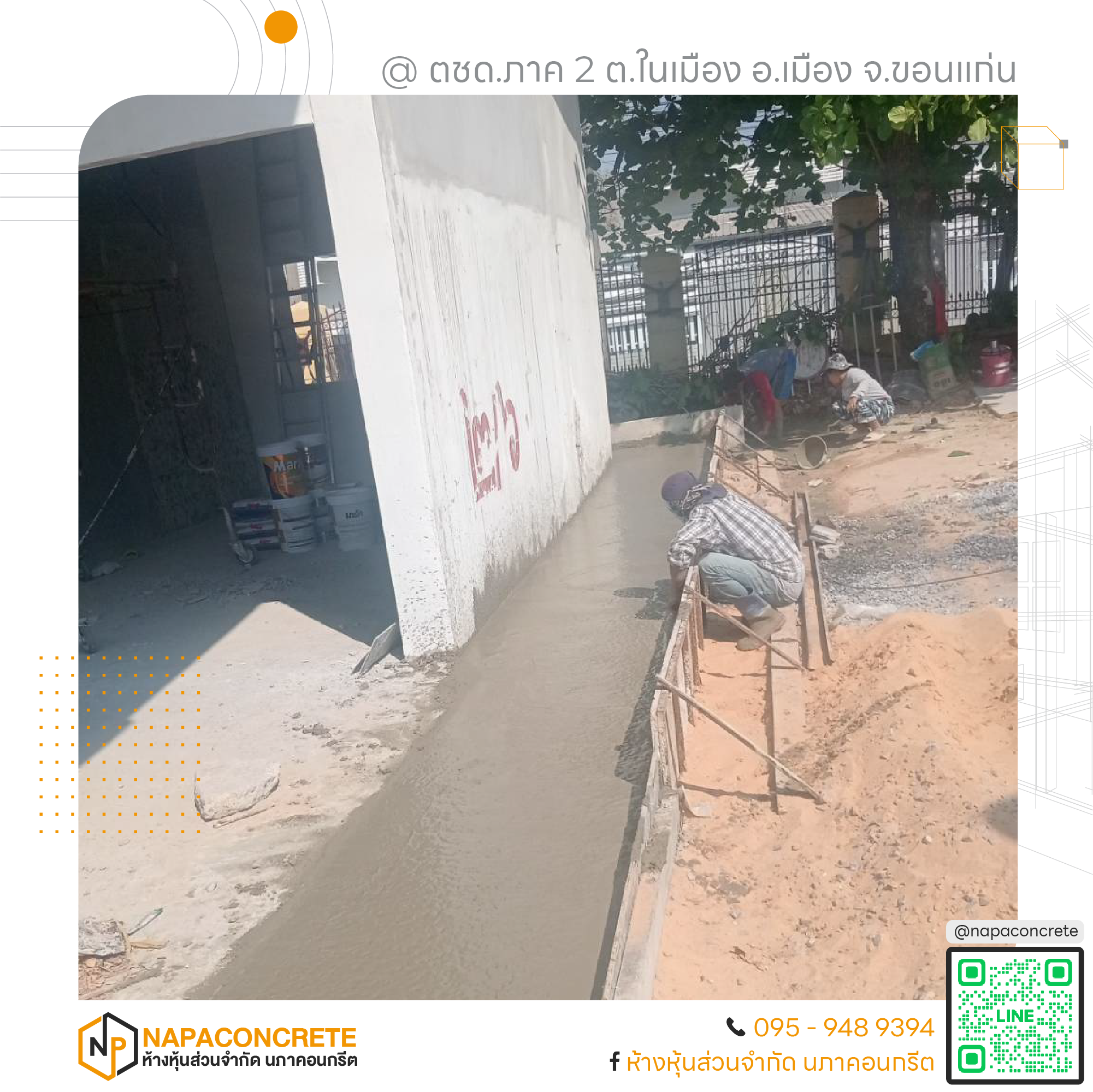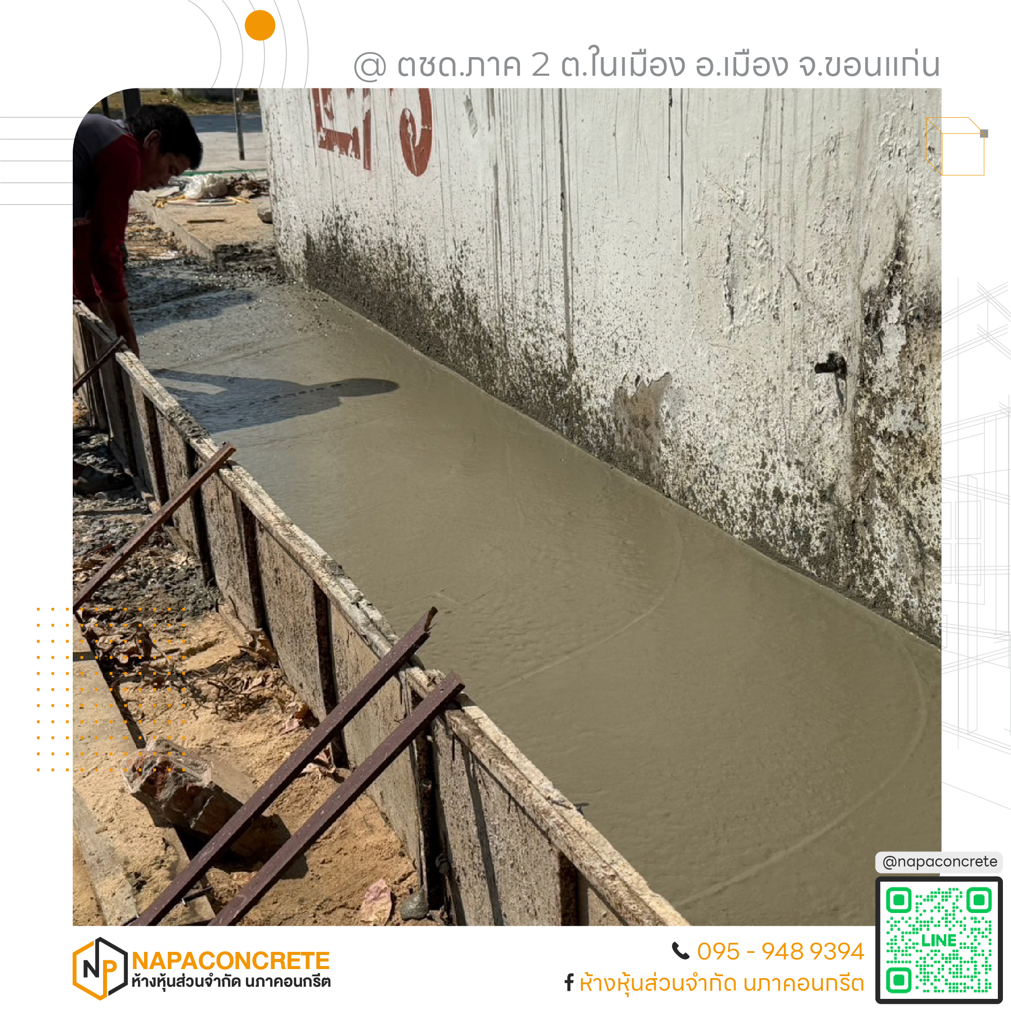 หจก.นภาคอนกรีต พร้อมให้บริการในพื้นที่จังหวัดขอนแก่นและจังหวัดใกล้เคียง ทุกงานที่เรารับ เราดูแลอย่างเต็มที่เหมือนเป็นงานของเราเอง สนใจสอบถามหรือขอใบเสนอราคา ติดต่อได้ที่เบอร์ 095-948-9394 หรือแอดไลน์ @napaconcrete