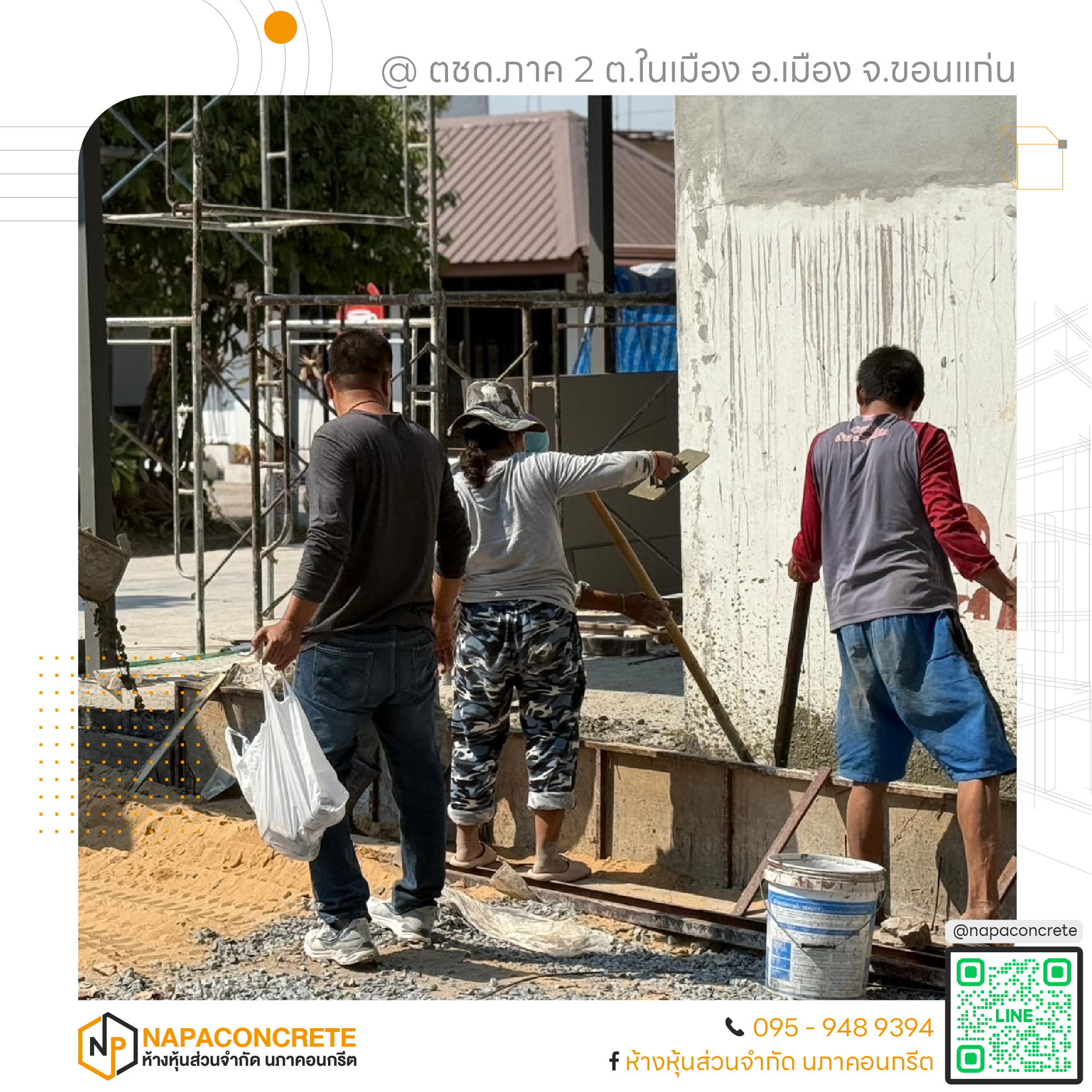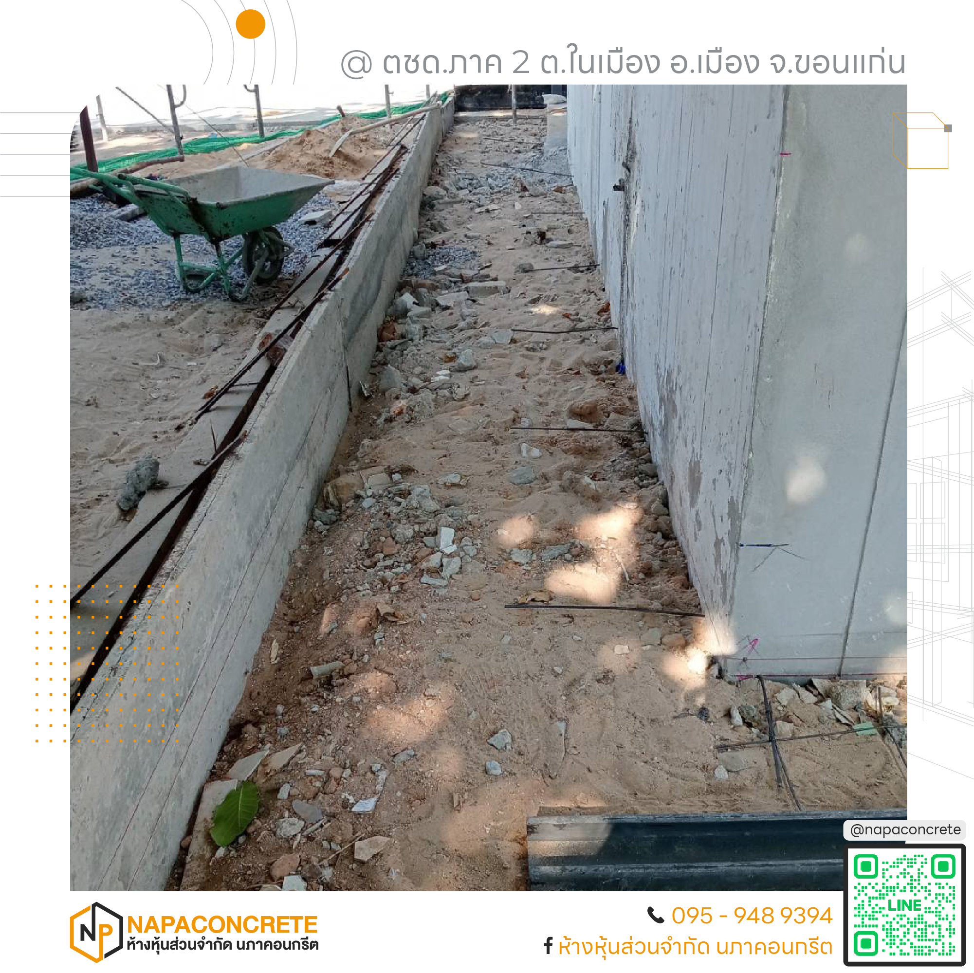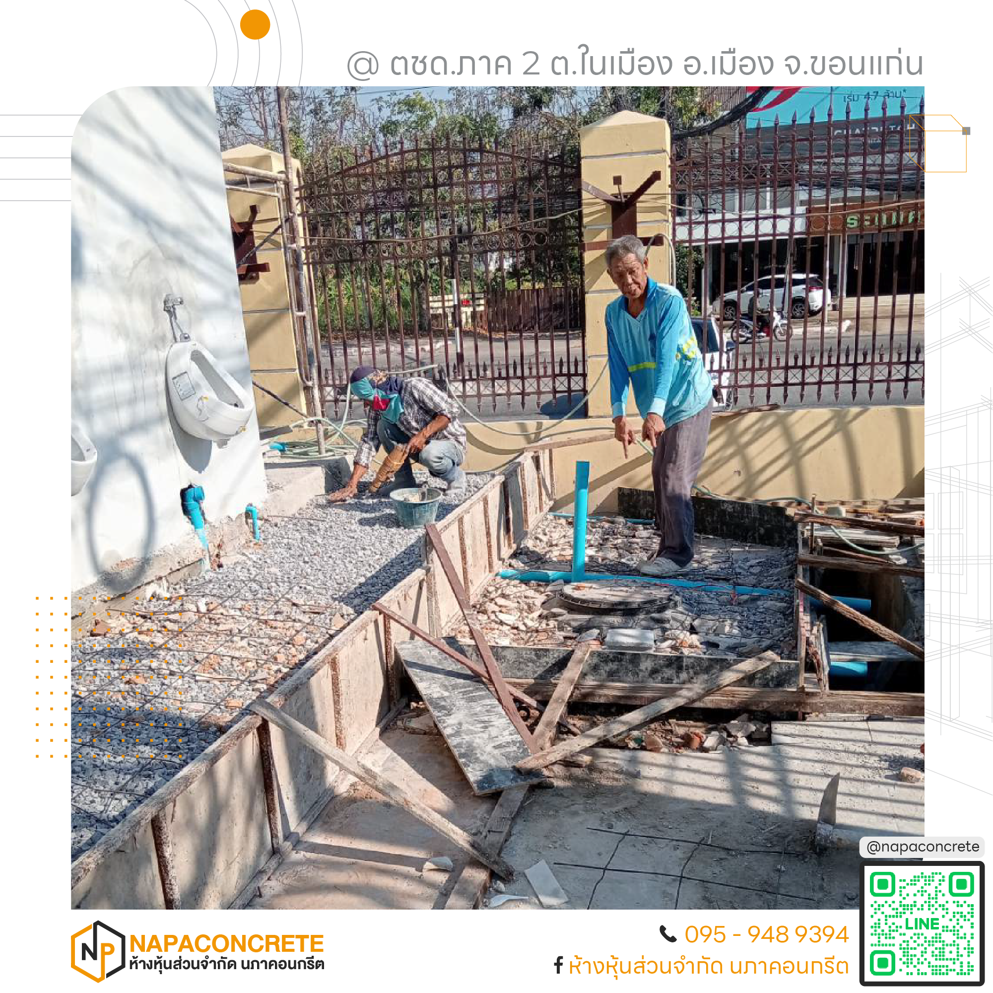 หจก.นภาคอนกรีต พร้อมให้บริการในพื้นที่จังหวัดขอนแก่นและจังหวัดใกล้เคียง ทุกงานที่เรารับ เราดูแลอย่างเต็มที่เหมือนเป็นงานของเราเอง สนใจสอบถามหรือขอใบเสนอราคา ติดต่อได้ที่เบอร์ 095-948-9394 หรือแอดไลน์ @napaconcrete